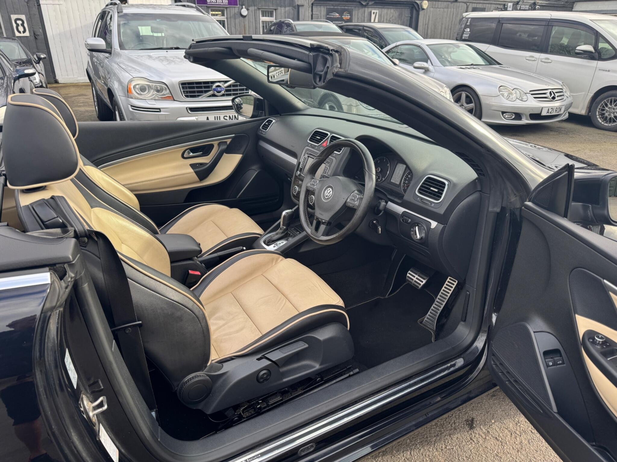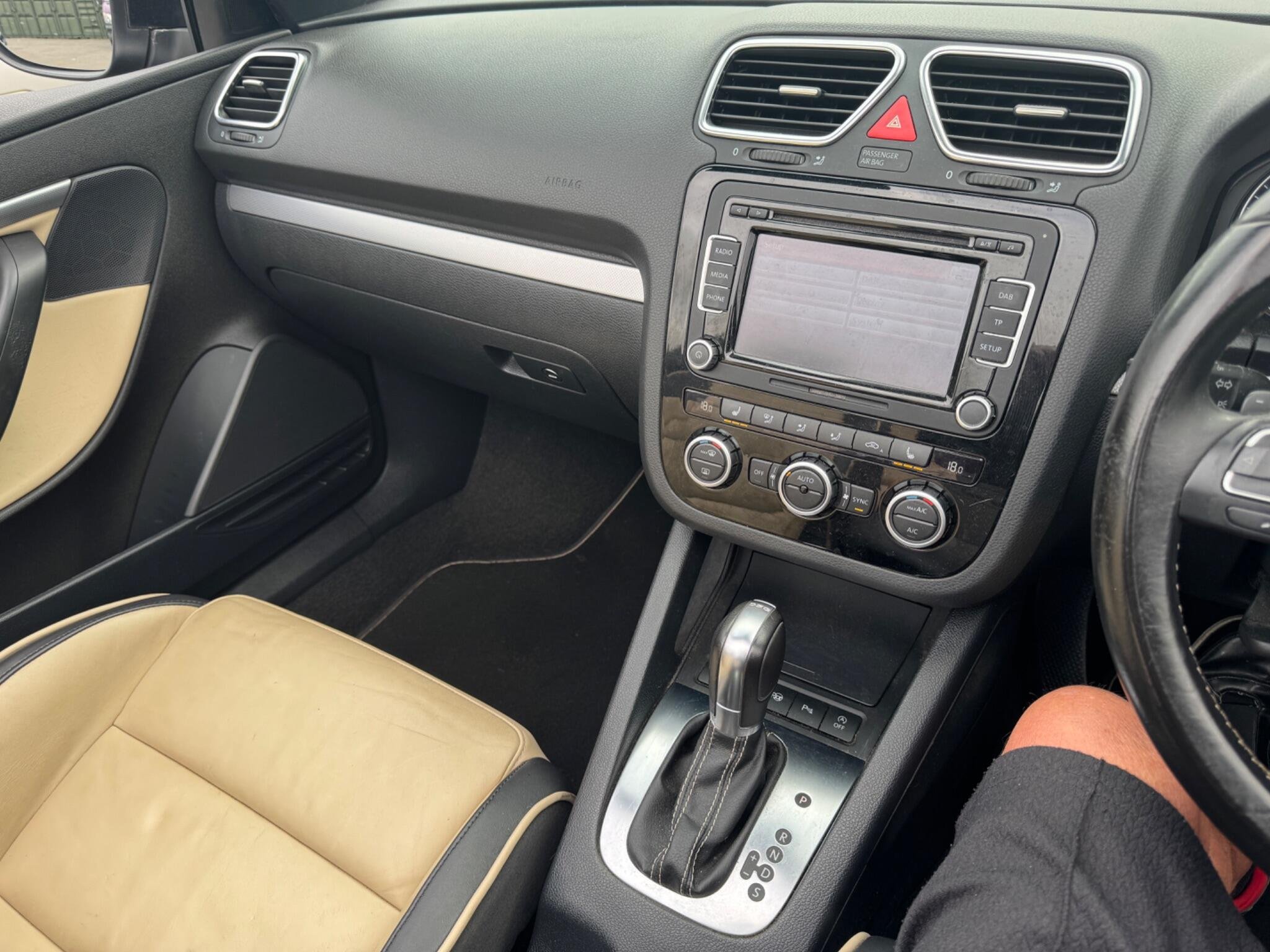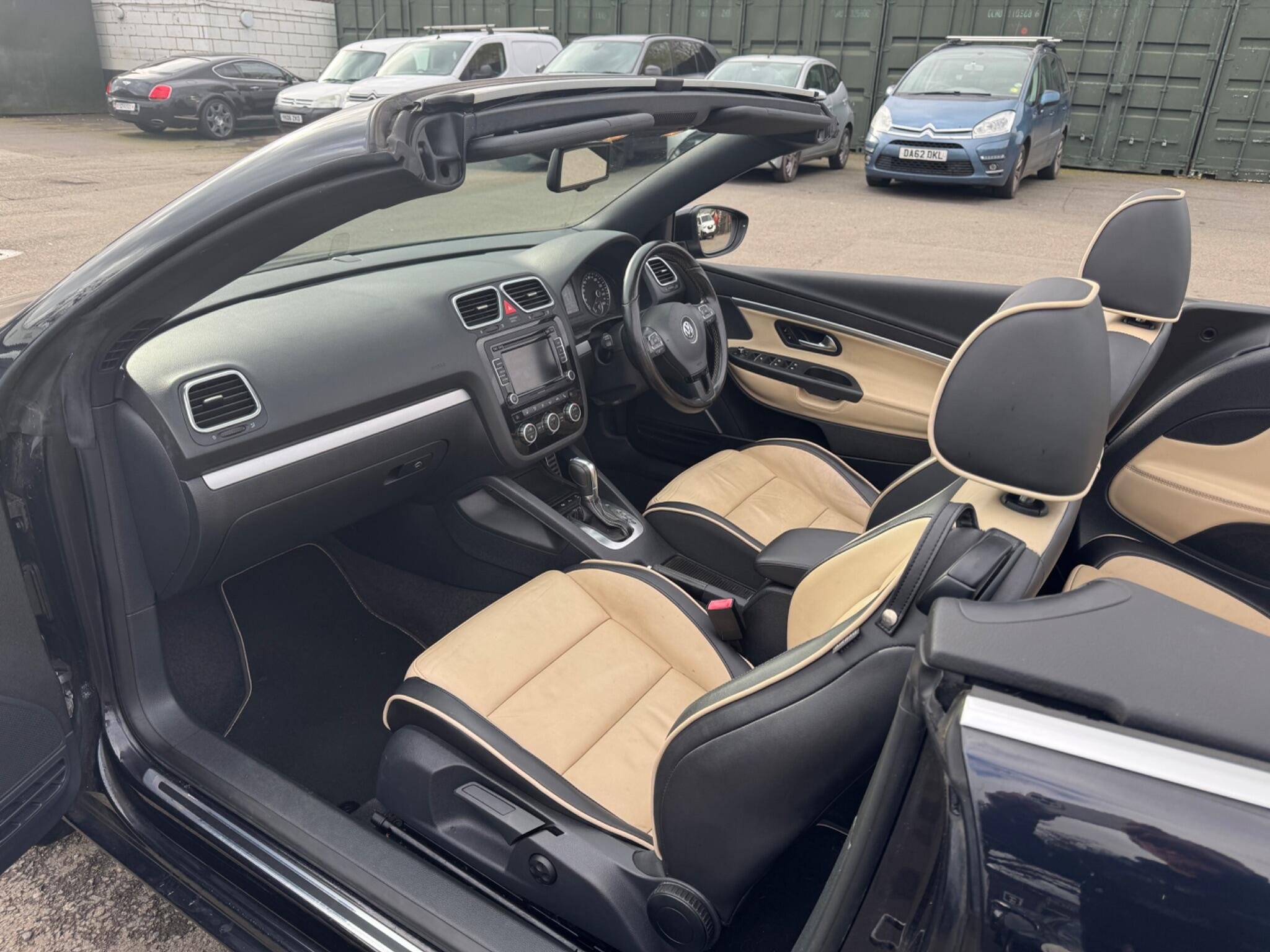 THIS Volkswagen Eos 2.0 TDI BlueMotion Tech Exclusive Cabriolet DSG AUTOMATIC Euro 5 POWER ROOF CONVERTIBLE LOOKS AMAZING IN EBONY METALLIC TWO TONE NAPPA LEATHER SAHARA BIEGE AND TITANIUM BLACK HEATED SEATS AND ALUMINIUM TRIM TO THE DASH AND DOOR CARDS YES VERY SMART. ONLY 1 OWNER & LOW MILEAGE FOR A 13 YEAR OLD CABRIOLET & THE ONE LOCAL OWNER HAS LOVED THE CABRIOLET FOR OVER 13 YEARS YOU CAN TELL THAT BY THE SUPERB CONDITION THE CONVERTIBLE IS IN YES AND IT LOW MILEAGE 75K A NEW MOT WITH NO ADVISES & A SERVICE COMES WITH SOME FACTORY EXTRAS, POWER ROOF CONVERTIBLE GLASS SUNROOF WHICH ALSO ACTS A SUNROOF WHEN HALF OPEN, CRUISE CONTRO, BLUE TOOTH TELEPHONE CONNECTION, STEREO RADIO WITH DAB & CD PLAYER, DUAL ZONE DIGITAL AIR CONDITIONING, FRONT & REAR PARKING AID, THE CAR HAS 2 SETS OF KEYS & ALL THE BOOKS AND MAUALS. This 2013 Volkswagen Eos TDI Exclusive is a standout example, having been cherished by just one owner since new. Powered by an efficient 2.0 litre diesel engine, this Exclusive trim model offers a refined driving experience. It comes equipped with the clever Park Assist system, which includes front parking sensors to aid manoeuvring, and DAB+ digital radio for enhanced entertainment. The steering wheel features paddle shifts for manual gear selection, adding a sporty feel. A key highlight is the innovative CSC roof system, a five section folding roof that incorporates a slide and tilt sunroof, allowing you to enjoy open air motoring in various configurations. Automatic driving lights, activated by a dusk sensor, ensure you always have optimal visibility. This Volkswagen Eos TDI Exclusive presents a compelling package, with its single owner provenance indicating careful use and maintenance. The inclusion of features like Park Assist and automatic headlights demonstrates a higher level of specification compared to many similar vehicles. Furthermore, its low insurance group rating makes it an economical choice for everyday driving.
